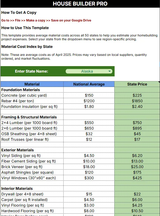 Home Building Material Prices Per State in USA