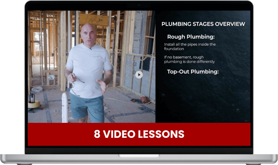 $149 – 8 core video lessons on plumbing stages, fixture marking, showers & toilets, contractor hand-offs, outdoor utilities, pools & septic, critical details, and inspections